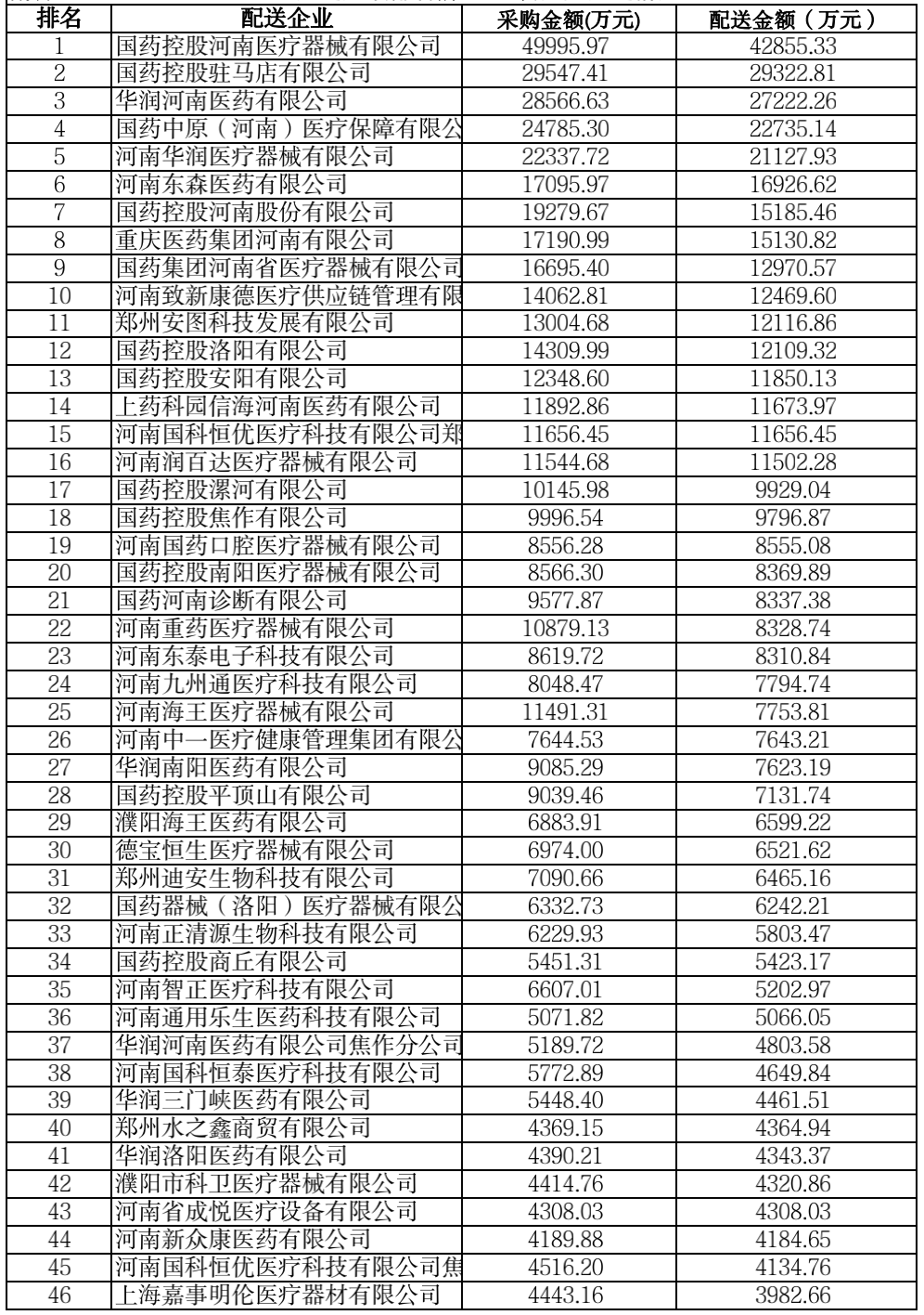 此外,河南省公共资源交易中心还发布了采购金额排名前100的医疗机构、供货金额排名前100的生产企业、配送金额排名前100的经营企业。
