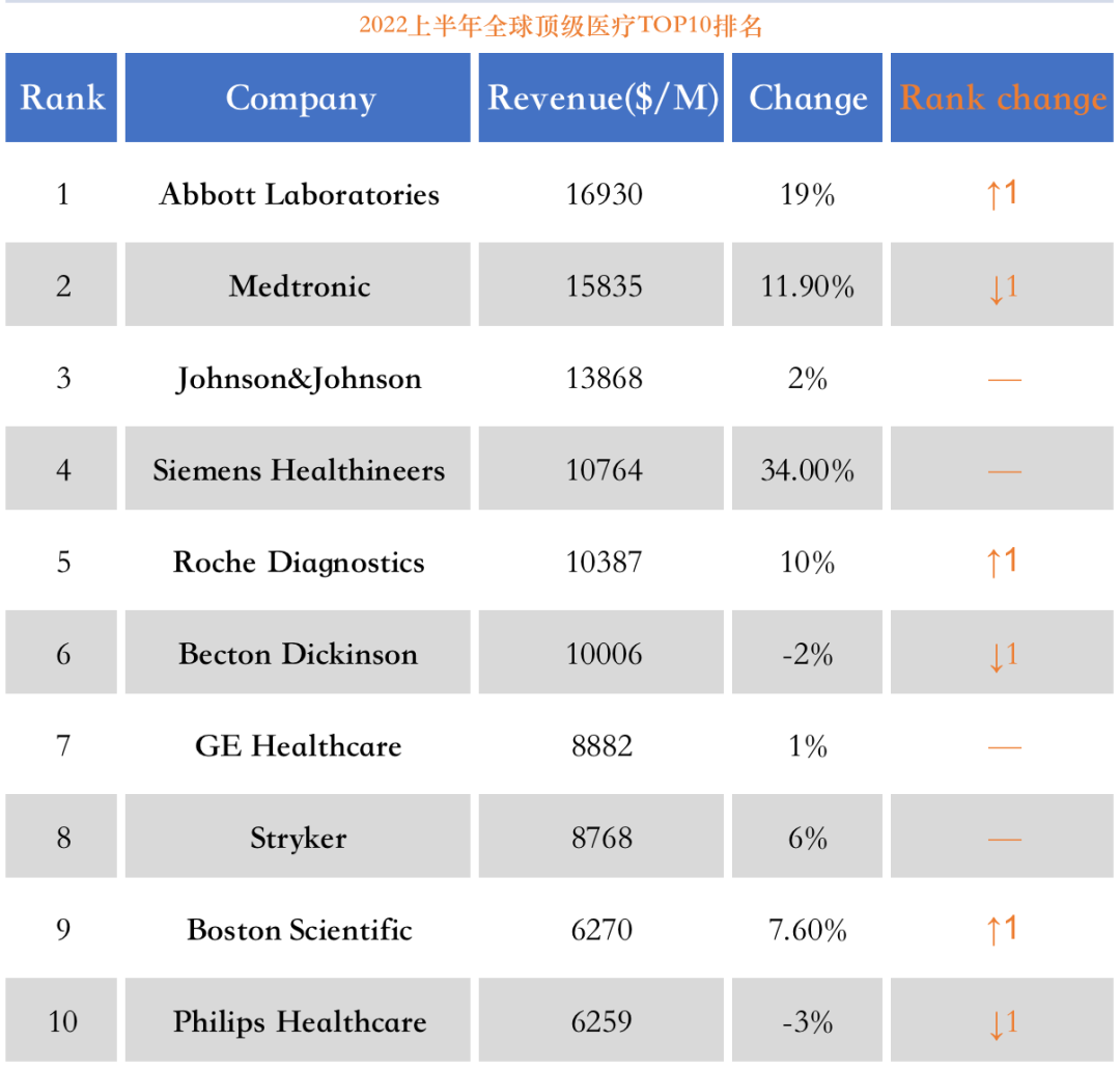 经历了漫长的蛰伏期,医疗器械领域终于迎来了一场厚积薄发。新冠疫情,让诊断、家用医疗器械迅速催熟,增量市场到来! 2022上半年,医疗行业整体强势增长!全球顶级医疗TOP10中: 雅培医疗问鼎,这也是近年来首次超过美敦力夺得第一!医疗业务营收169.30亿美元,同比+18.8%,得益于新冠病毒快速检测产品拉动。雅培预测新冠病毒检测产品销量的强劲势头将延续至2023年。 美敦力退居第二,全年营收158.35亿美元,同比+11.9%。整体业绩开始回暖,所有业务均实现正增长。美敦力目前正在实施新运营模式,为未来的长期成功做准备。 强生医疗器械业务营收138.68亿美元,同比+2.3%,消费者医疗业务剥离在即。 西门子医疗总营收107.64亿美元,同比+34%,其中诊断业务增长最高。受中国市场新冠相关以及供应链中断,对整体营收有轻微负面影响。值得注意的是,西门子医疗目前已经进入“2025战略”第三阶段——“New Ambition”。 罗氏诊断营收99.48亿瑞士法郎(103.87亿美元),同比+10%。新冠疫情相关产品带动业绩的增长,这种增长还将持续到明年。 碧迪医疗营收100.06亿美元,同比-2.1%。主要是疫情之下,生命科学业务下滑所导致。其他如诊断测试、药物输送解决方案、重症护理用品均实现增长。 GE医疗营收88.82亿美元,同比+1%。两大细分业务——医疗系统(HCS)正式回暖,药物诊断(PDx)下滑!超声管线可能是GE医疗近几年下一步重点布局的方向。 史赛克营收87.68亿美元,同比+6.3%。在发布财报的同时,史赛克表示未来还将把重点放在手术机器人领域。 波士顿科学营收62.7亿美元,同比+7.6%。有消息表示,今年下半年波士顿科学将会投资在外周干预和电生理领域。 飞利浦医疗营收62.59亿美元,同比-3%,主要还是互联关护业务带来的下滑。 ▲ 2022上半年全球顶级医疗TOP10排名 2022上半年医疗领域营收(百万美元):16930 同比:+18.8% 7月20日,雅培发布2022上半年财报,全年营收231.52亿美元,同比+11.9%。雅培增长最快的为诊断业务,得益于新冠病毒快速检测产品拉动。其中: 医疗业务:169.30亿美元,同比+18.8%。 雅培充分发挥研发实力,在规模大、增长快的市场推出了诸多新产品,雅培预测新冠病毒检测产品销量的强劲势头将延续至2023年。 细分业务领域: 诊断业务:营收96.08亿美元,同比+32.3%。 快速诊断:营收63.04亿美元,同比+67.2%; 分子诊断:营收6.32亿美元,同比-14.2%; 传统诊断:营收24.04亿美元,同比-3.4%; 床旁诊断:营收2.67亿美元,同比+0.4%。 医疗设备业务:营收73.22亿美元,同比+4.8%。 节律管理:营收10.72亿美元,同比-1.3%; 心脏电生理:营收9.71亿美元,同比+5.8%; 心衰:营收4.62亿美元,同比+9.7%; 心血管:营收12.72亿美元,同比-4.5%: 结构性心脏病:营收8.51亿美元,同比+6.5%; 神经调节:营收3.76亿美元,同比-4.6%; 糖尿病业务:营收23.18亿美元,同比+13.8%。 雅培公司董事会主席兼首席执行官Robert B. Ford表示:“雅培在2022上半年交出了完美的成绩单,我们实现了超过40%的每股收益增长,远超今年年初设定的增长目标。” 2022上半年医疗领域营收(百万美元):15835 同比:+11.9% *美敦力2022上半年财报区间:2021年4月28日到2021年10月29日。 2021年11月23日,美敦力发布2022上半年财报,全年营收158.35亿美元,同比+11.9%。整体业绩开始回暖,所有业务均实现正增长。 细分业务表现: 心血管业务:营收57.17亿美元,同比+10.8%。 心脏节律与心衰(CRHF):营收29.54亿美元,同比+10.5%; 冠状及结构性心脏(CSH):营收15.37亿美元,同比+13%; 主动脉与外周血管(APV):营收12.26亿美元,同比+9%。 微创治疗业务(柯惠):营收46.21亿美元,同比+13.1%。 外科创新(SI):营收30.51亿美元,同比+23.4%; 呼吸、胃肠和肾脏(RGR):营收15.7亿美元,同比-2.7%。 恢复性疗法:营收43.4亿美元,同比+15%。 颅骨和脊柱技术:营收21.89亿美元,同比+8.6%; 临床疗法:营收12.75亿美元,同比+23.2%; 神经调节:营收8.75亿美元,同比+20.7%。 糖尿病业务:营收11.57亿美元,同比+1.8%。 美敦力全球CEO Geoff Martha在半年报会议上表示:“第一季度强势增长,疫情之后,美敦力整体复苏。我们正在为未来的长期成功做准备,因为我们正在实施新运营模式,并利用许多大机会来赢得市场份额,创造和颠覆大型市场。” 2022上半年医疗领域营收(百万美元):13868 同比:+2.3% 7月19日,强生发布了2022年上半年财报,全球总营收为474.46亿美元,同比+4%,超出预期,其中: 制药业务营收为261.86亿美元,同比+6.5%; 医疗器械业务营收138.68亿美元,同比+2.3%; 消费者健康业务成绩欠佳,营收为79.91亿美元,同比-1.4%。 医疗器械业务: 介入解决方案营收21.41亿美元,同比+7.4%; 骨科营收43.45亿美元,同比+0.1%; 外科手术营收48.84亿美元,同比-0.2%; 视力保健营收24.98亿美元,同比+7.3%。 其中,骨科细分业务: 髋关节:营收7.77亿美元,同比+4.1%,美国市场+5.2%; 膝关节:营收6.88亿美元,同比+3.1%。国际市场下滑0.4%,美国市场+5.6%; 创伤:营收14.44亿美元,同比+0.1%; 脊柱&其他:营收14.36亿美元,同比-3.2%,是强生骨科唯一下滑的子业务,其中美国区下滑最明显(-3.9%)。 值得注意的是2022年1月3日,强生CEO Alex Gorsky卸任担任了十年的CEO一职,由Joaquin Duato担任CEO,开启下一个“黄金十年”。 今年上半年是Joaquin Duato上任后的第一份业绩报告,在会议上 Joaquin Duato 表示:“强生公司第二季度稳健的业绩反映了我们公司在面临宏观经济挑战,下半年业绩有望超出预期”。 2022上半年医疗领域营收(百万美元):10764 同比:+34% *西门子医疗2022上半年财报